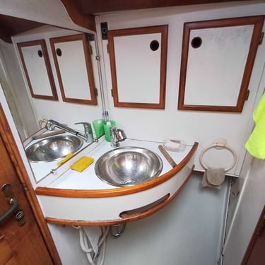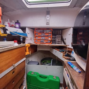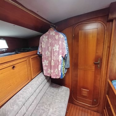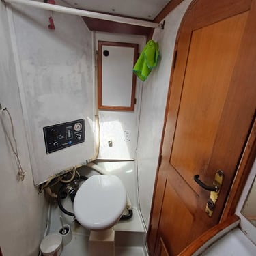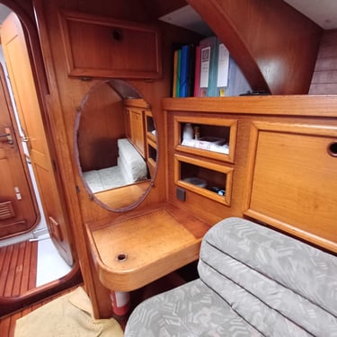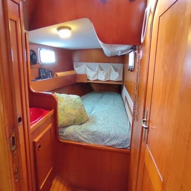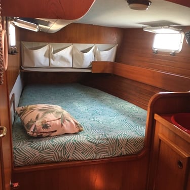 Cabine propriétaire à l’avant avec grand lit à bâbord, banquette (ou lit bébé) avec sa coiffeuse à tribord, salle de bain avec cabinet de toilette électrique.
