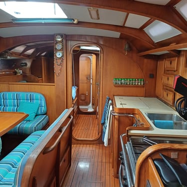Coque monolithique fibre de verre renforcée kevlar, construction très solide. Pont sandwich et tech dans le cockpit et la jupe